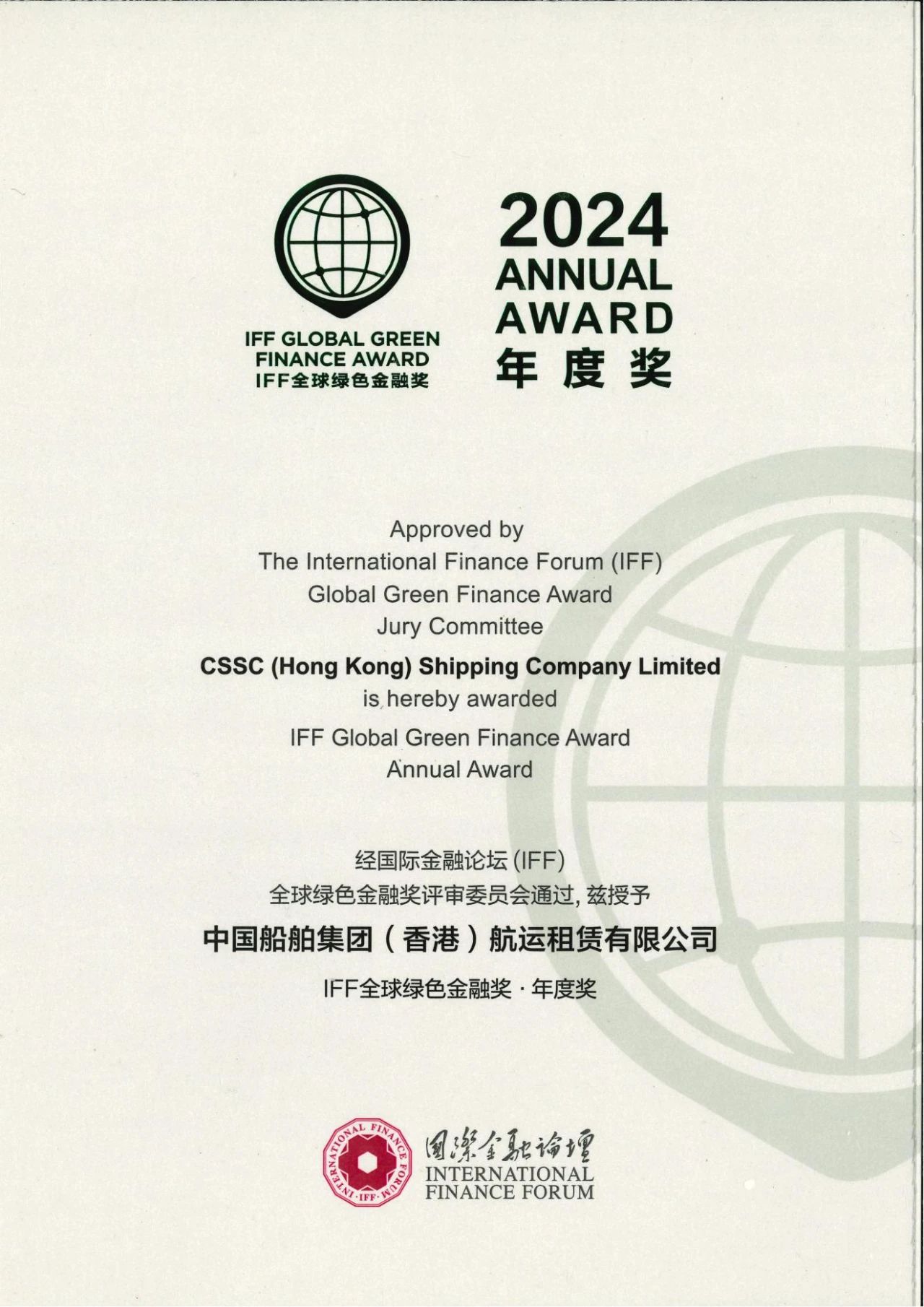 日前,在中國香港舉行的國際金融論壇(IFF)第21屆全球年會(huì)(F20峰會(huì))上,發(fā)布了第五屆“IFF全球綠色金融獎(jiǎng)”評選結(jié)果。中國船舶集團(tuán)中船租賃憑借其在綠色金融領(lǐng)域綜合實(shí)踐的杰出表現(xiàn),首度榮膺“IFF全球綠色金融獎(jiǎng)——年度獎(jiǎng)”。這是繼2021年獲得“IFF全球綠色金融創(chuàng)新獎(jiǎng)”,中船租賃再上一層樓,榮獲年度大獎(jiǎng)。