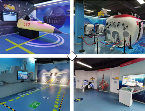 整個(gè)展館內(nèi)分布著護(hù)航體驗(yàn)區(qū)、VR綜合體驗(yàn)區(qū)、航母艦室漫游體驗(yàn)區(qū)、近海VR鉆井平臺(tái)體驗(yàn)區(qū)、艦載機(jī)起飛體感指揮體驗(yàn)區(qū)、航母艦載機(jī)空體驗(yàn)區(qū)等,可以讓參觀者模擬駕駛我國(guó)船海重器,親身感受搏浪滄海、護(hù)衛(wèi)海疆的震撼與自豪,使得船舶館成為海洋特色鮮明、模型館藏豐富、互動(dòng)體驗(yàn)感強(qiáng)的軍事科普教育展館和軍事文化娛樂(lè)園區(qū)。