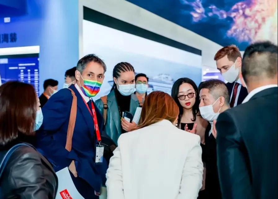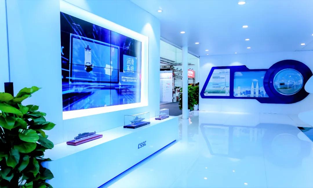 中國船舶集團展臺摒棄了“傳統色彩矩陣”,用“深海藍”加 “風機白”打造出大氣磅礴的開合式復合空間域,細節上則采用生態為先、大道至簡、科技為尚三大設計語言,將“風傳送”“海推動”“碳排放”業務生態鏈條進行了全方位的解構,吸引了眾多觀展人士駐足。