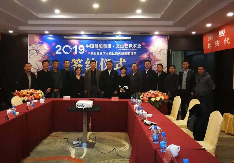 2019年12月22日,中國船舶集團-云南文山云楓農業丘北縣林下養雞“以購代捐”采購訂單簽約儀式在云南丘北縣舉行。