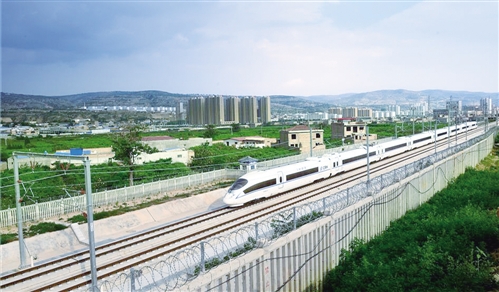 6月15日,寶蘭高鐵試驗列車駛過甘肅秦安縣城區。 李琛奇攝