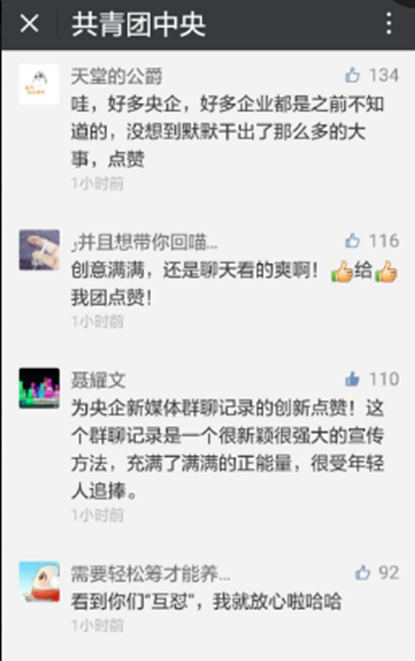 “‘央企新媒體群聊記錄’刷屏是央企新媒體親民傳播風(fēng)格的正向反饋,能引發(fā)受眾共鳴的話題加上激發(fā)和感染的受眾,從而引發(fā)了積極的再傳播力量”,人民網(wǎng)輿情監(jiān)測(cè)室常務(wù)副秘書(shū)長(zhǎng)單學(xué)剛同樣不諱受眾在其中的作用。
