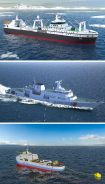 圖1:南極磷蝦捕撈加工船效果圖;圖2:首艘萬噸級海事巡邏船效果圖;圖3:首個民用涉核總體設計項目效果圖。