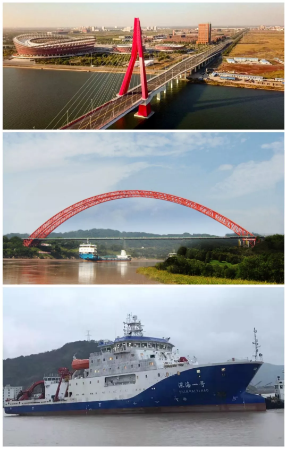 ????上圖所示均為武船集團承建的項目。圖1:遼寧盤錦遼濱沿海經(jīng)濟開發(fā)區(qū)大橋;圖2:四川合江長江一橋;圖3:我國自主研制的第一艘載人潛水器支持母船“深海一號”。