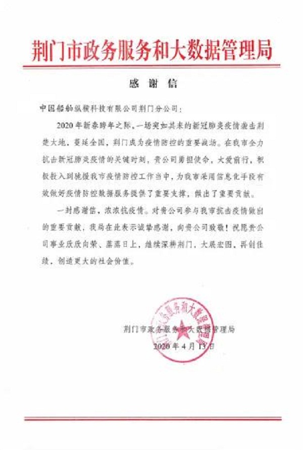 ????中國船舶集團(tuán)七一〇所縱橫公司荊門分公司收到荊門市政務(wù)服務(wù)和大數(shù)據(jù)管理局寄來的感謝信,感謝其在抗擊新冠肺炎疫情的關(guān)鍵時刻,為荊門市采用信息化手段有效做好疫情防控數(shù)據(jù)服務(wù)提供了重要支撐,作出了重要貢獻(xiàn)。
