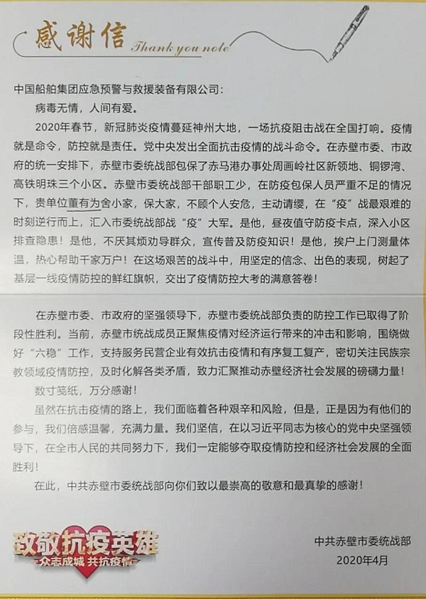 ????中共赤壁市委統(tǒng)戰(zhàn)部特向中國船舶集團(tuán)旗下中國應(yīng)急發(fā)來感謝信,對中國應(yīng)急員工董有為舍小家保大家,不顧個人安危,主動請纓,在戰(zhàn)“疫”最艱難的時刻逆行而上表示感謝和致敬。