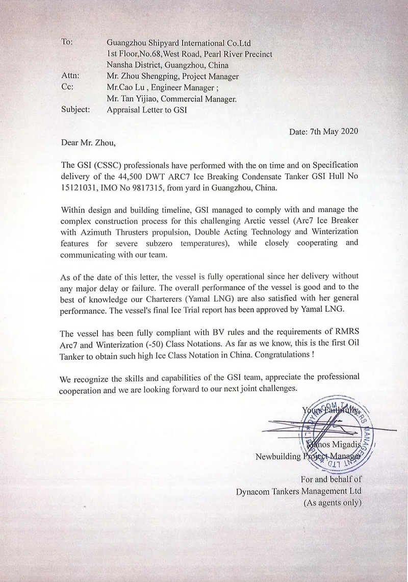 ????5月7日,中國船舶集團旗下廣船國際收到了來自希臘Dynacom航運公司的感謝信,信中贊揚了廣船國際為其建造的極地凝析油船“BORIS SOKOLOV(鮑里斯索科洛夫)”號