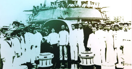 △1923年,孫中山與靠泊黃埔船廠的永豐艦(后更名為中山艦)官兵合影