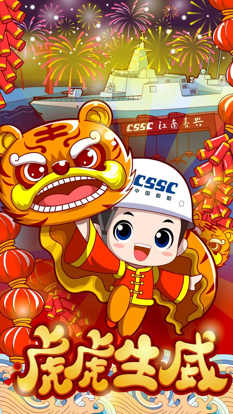 海報采用國潮畫風,中間部分“江小南”穿著新衣舉著虎頭,寓意新的一年中國船舶人虎虎生威,上面部分以重要產品和廠區設備為主,詮釋江南造船建造國之重器的初心和使命,同時輔以鞭炮、煙花、燈籠等新年元素,使海報充滿喜慶祥和的新年氛圍。