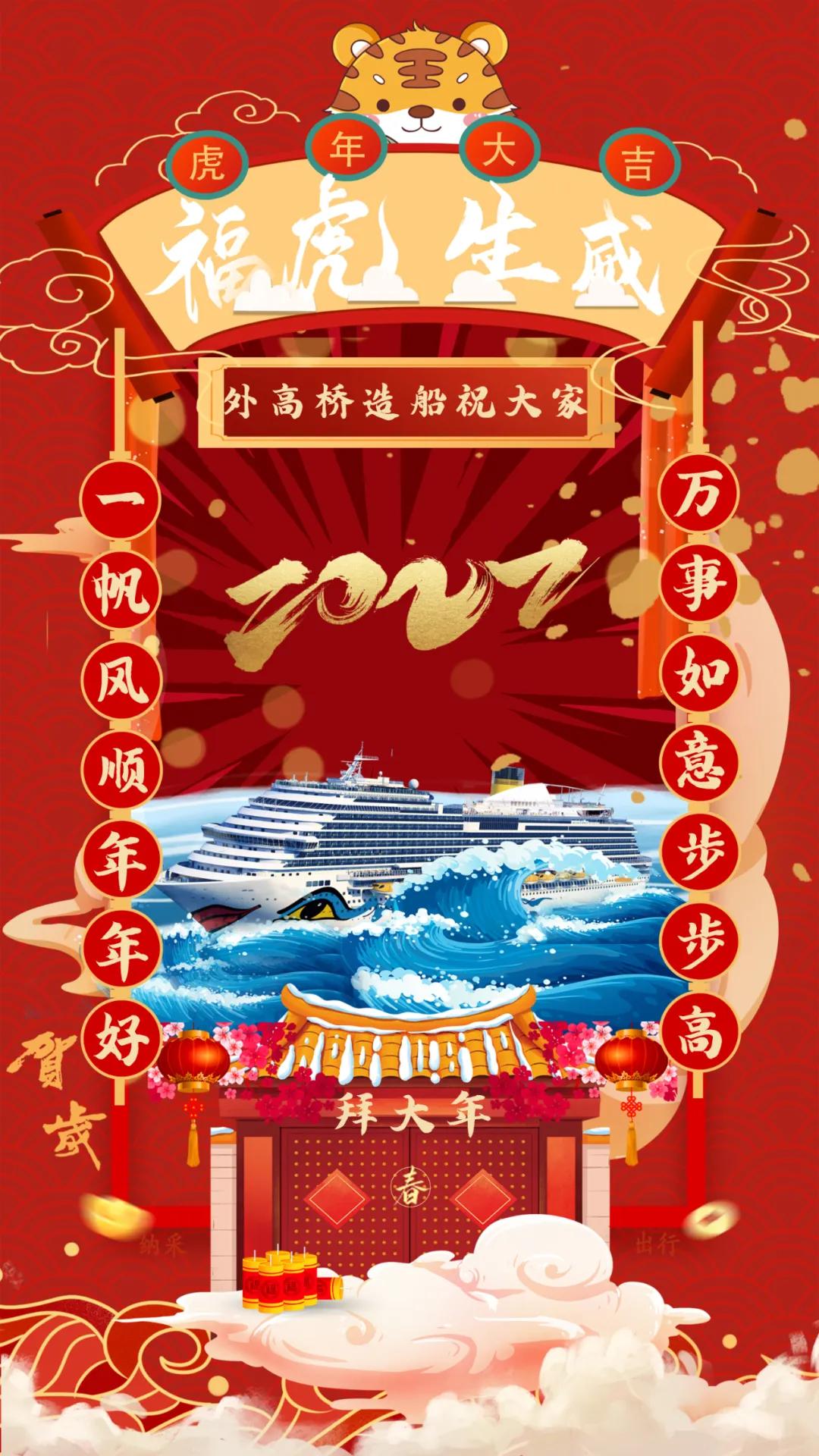 以門為前景,郵輪在海上乘風破浪,寓意中國首制大型郵輪建造能取得開門紅!以紅色為背景,表達新年喜慶的節日氛圍,也祝福祖國郵輪產業的發展紅紅火火,蒸蒸日上!