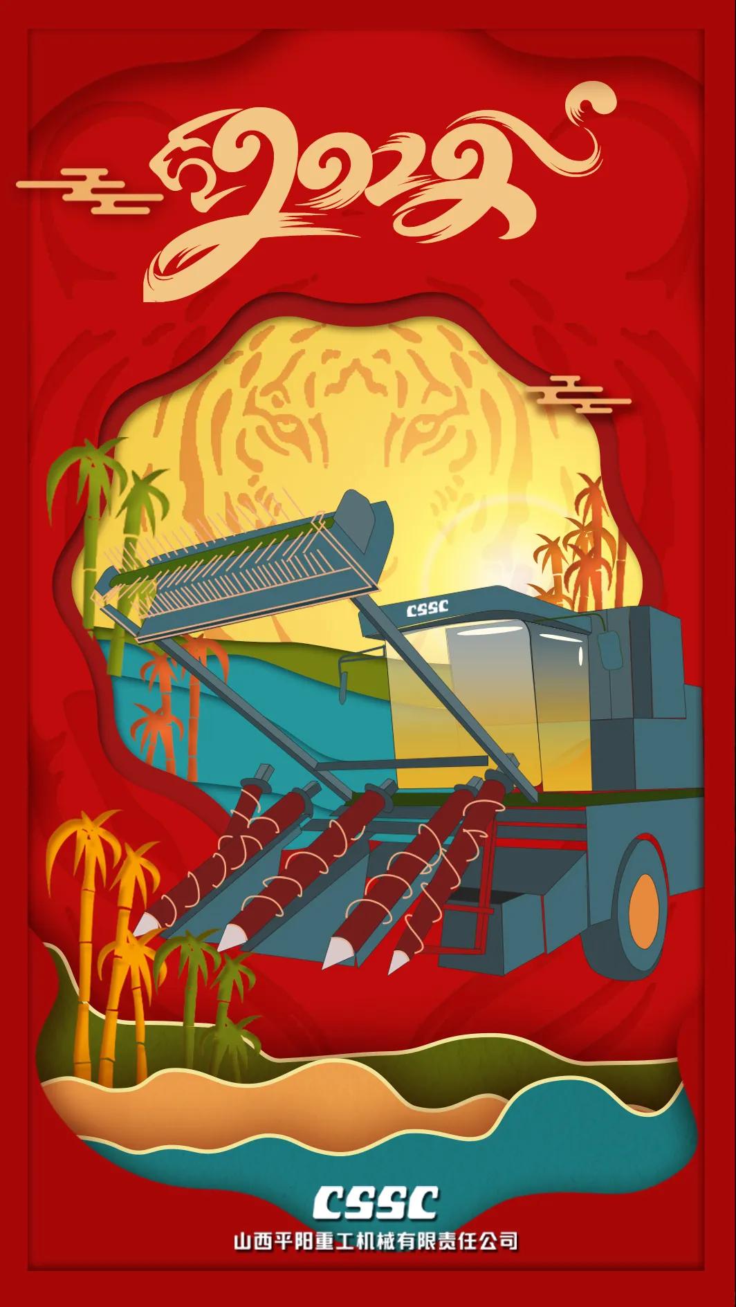 海報采用剪紙風格,層層遞進的縱深感傳遞著平陽人不斷探索創新的拼搏精神;海報主體為平陽重工新產品——甘蔗收獲機,展示著平陽風采;海報以“虎紋”為背景,以紅色為主色調,烘托出虎年的喜慶氛圍。