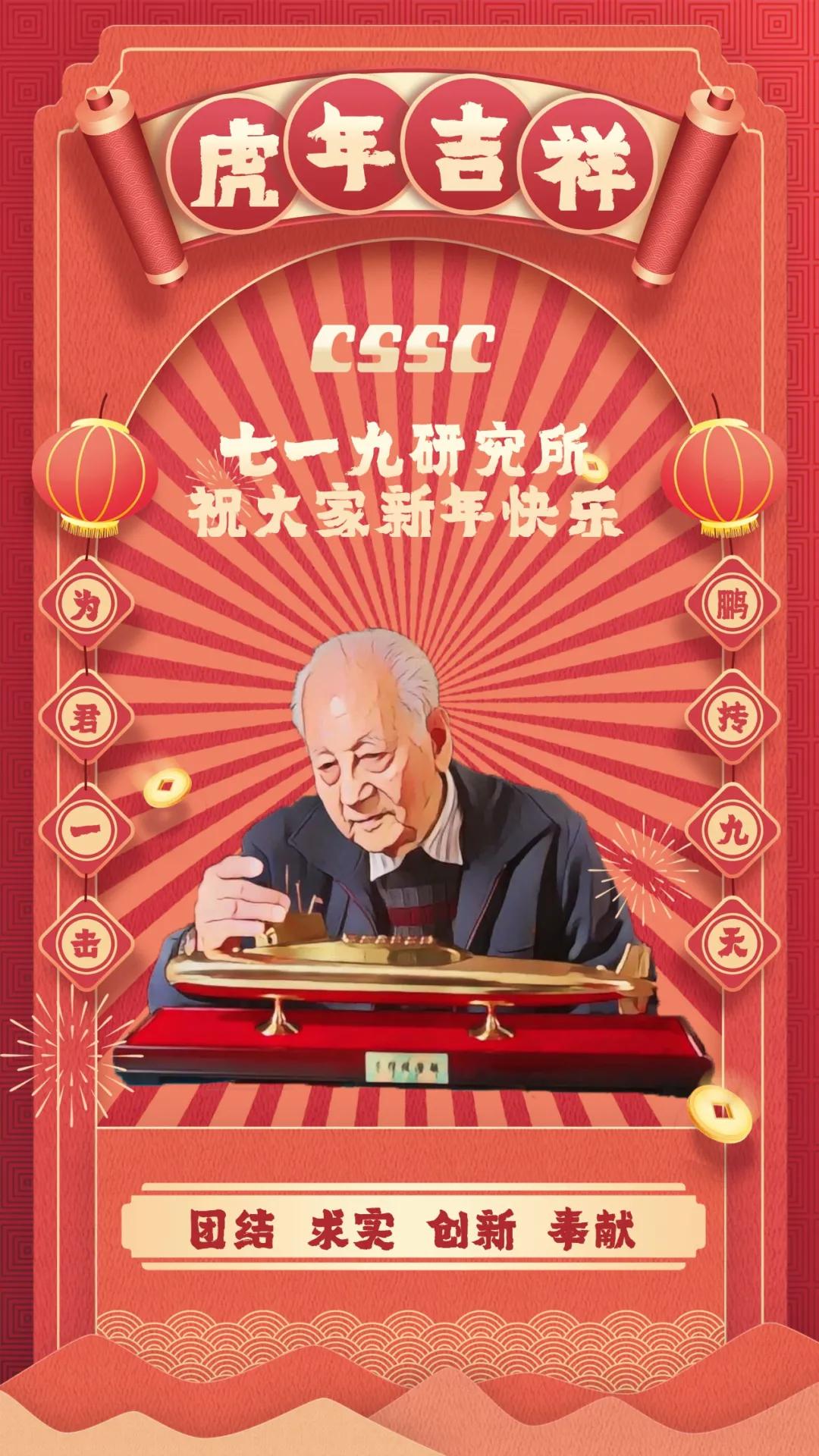 節日的煙花詮釋喜慶,大紅的燈籠點亮祝福!黃旭華院士作為七一九所典型人物代表,認真注視著他為之奉獻一生的艇,也反映了這條戰線上科技工作者們“團結、求實、創新、奉獻”的工作作風。“為君一擊 鵬摶九天”暗藏“一九”二字,反映出七一九所肩負的責任之大,使命之重,表達了軍工人將船舶事業做大做強的決心。