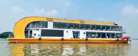 “廣游19”配置3015kWh純鋰電池驅動,Z形全回轉舵槳推進,經濟航速下可滿足7小時續航要求。船體上建采用大面積玻璃幕墻,具有開闊的觀光視野,可360度觀賞珠江日景夜景,可提供江景游覽、娛樂餐飲、會議招待、婚禮、音樂舞會、年會等綜合服務。
