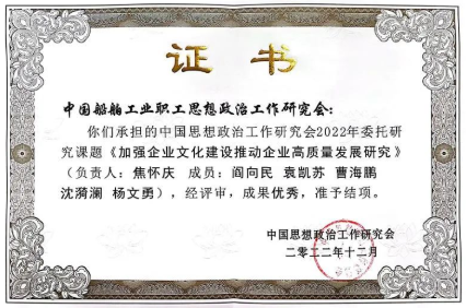 近日,由中國船舶工業(yè)職工思想政治工作研究會申報的中國思想政治工作研究會2022年委托課題《加強企業(yè)文化建設(shè),推動企業(yè)高質(zhì)量發(fā)展研究》評審結(jié)果公布,成果優(yōu)秀,報經(jīng)中央宣傳部領(lǐng)導審定準予結(jié)項。這是中國船舶政研會首次承擔中國政研會委托課題并獲評優(yōu)秀。