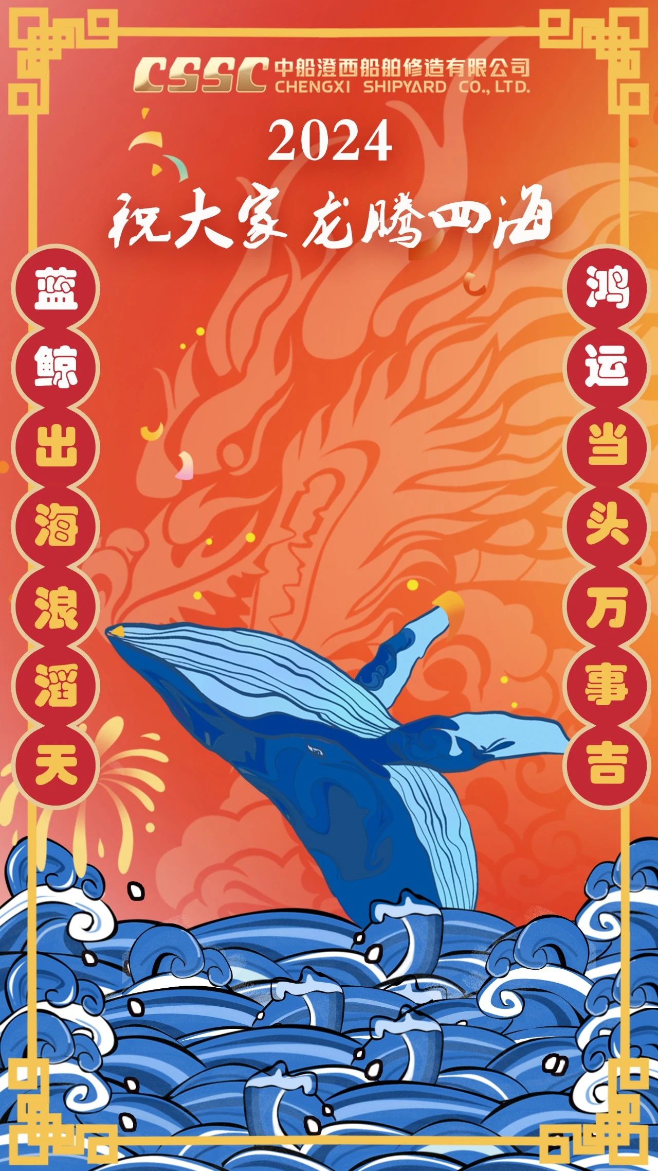 創(chuàng)意說明:海報以龍年為主題,主體為藍(lán)鯨。自研8萬噸級散貨船“藍(lán)鯨”系列和5萬噸級油化船“鴻運”系列是中船澄西命名的品牌船型,凝結(jié)了公司全員智慧。