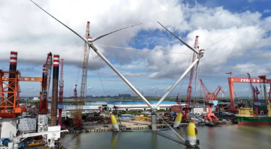 7月3日,由中國(guó)船舶集團(tuán)旗下黃埔文沖建造的漂浮式風(fēng)電平臺(tái)“明陽天成號(hào)”(OceanX)完成吊裝。