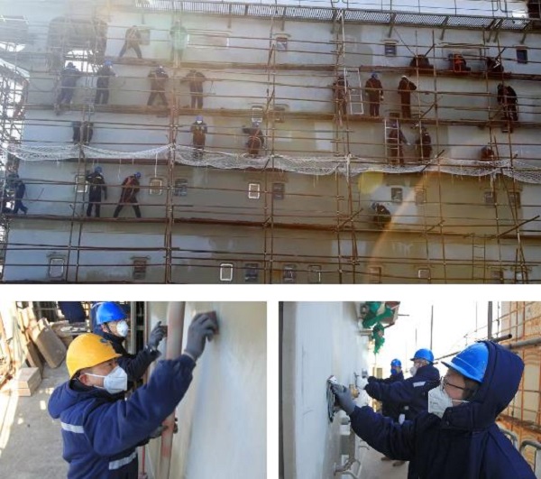 此次活動共完成600多平方米的生活區(qū)外板打磨,占總面積的71%,墻面光潔度完全滿足施工要求,為該船后續(xù)涂裝工作的開展創(chuàng)造了有利條件。黨員們用實際行動將黨旗插在了生產(chǎn)最前線,讓黨徽在戰(zhàn)“疫”保交船的攻堅戰(zhàn)中熠熠生輝。