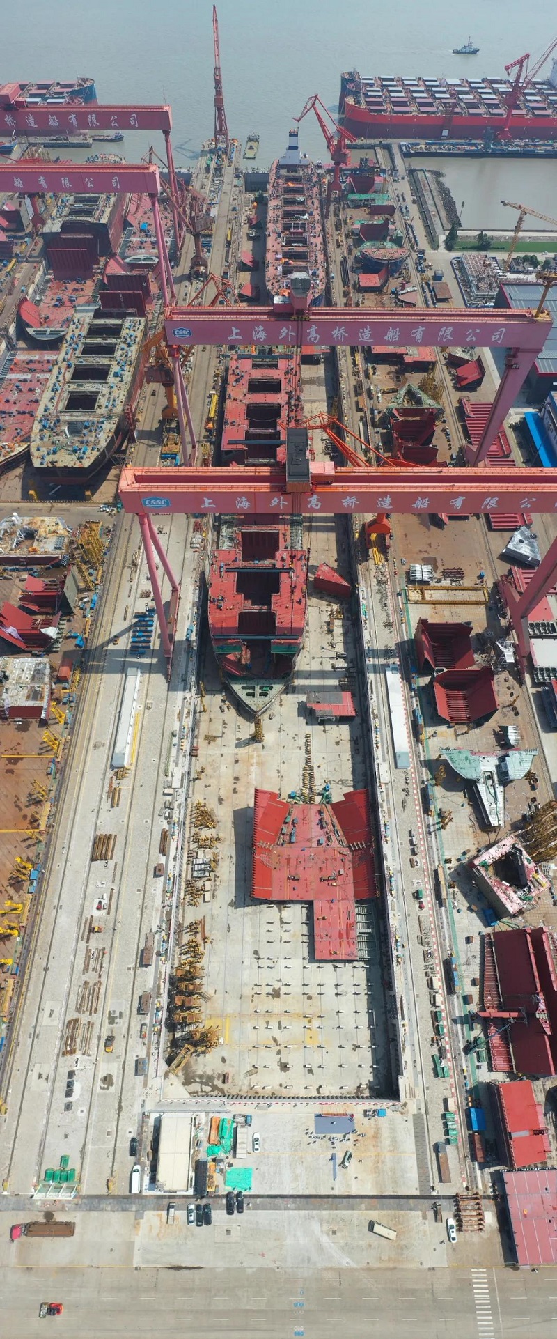 該項改造工程是將現有船塢從540米向陸側延伸200米,形成長740米、寬76米的“巨無霸”船塢,其周長達到1.632千米,面積相當于7個標準足球場,能同時滿足1艘大型郵輪總組、1艘大型郵輪舾裝的需求,達到年產1艘半大型郵輪的建造要求。
