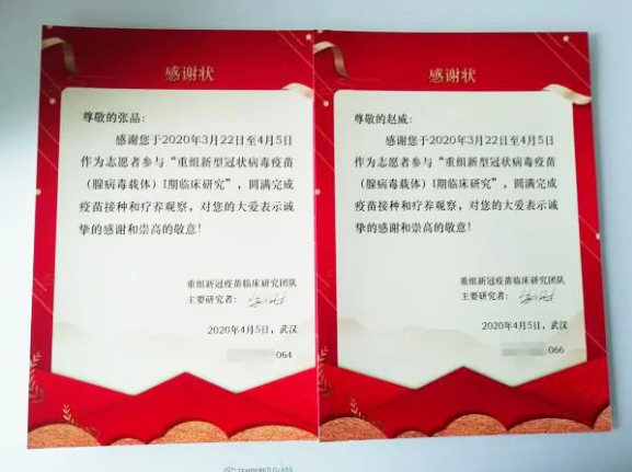 △ 新冠疫苗臨床研究團隊給張晶夫婦頒發的“感謝狀”