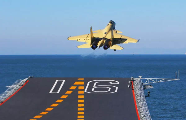 殲—15艦載機在遼寧艦上起飛。新華社記者 查春明 攝