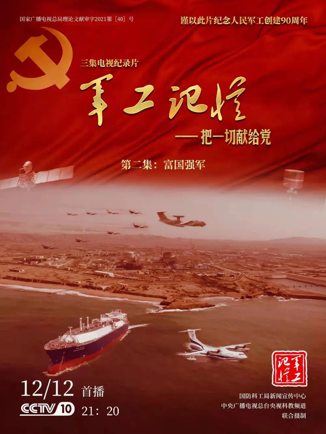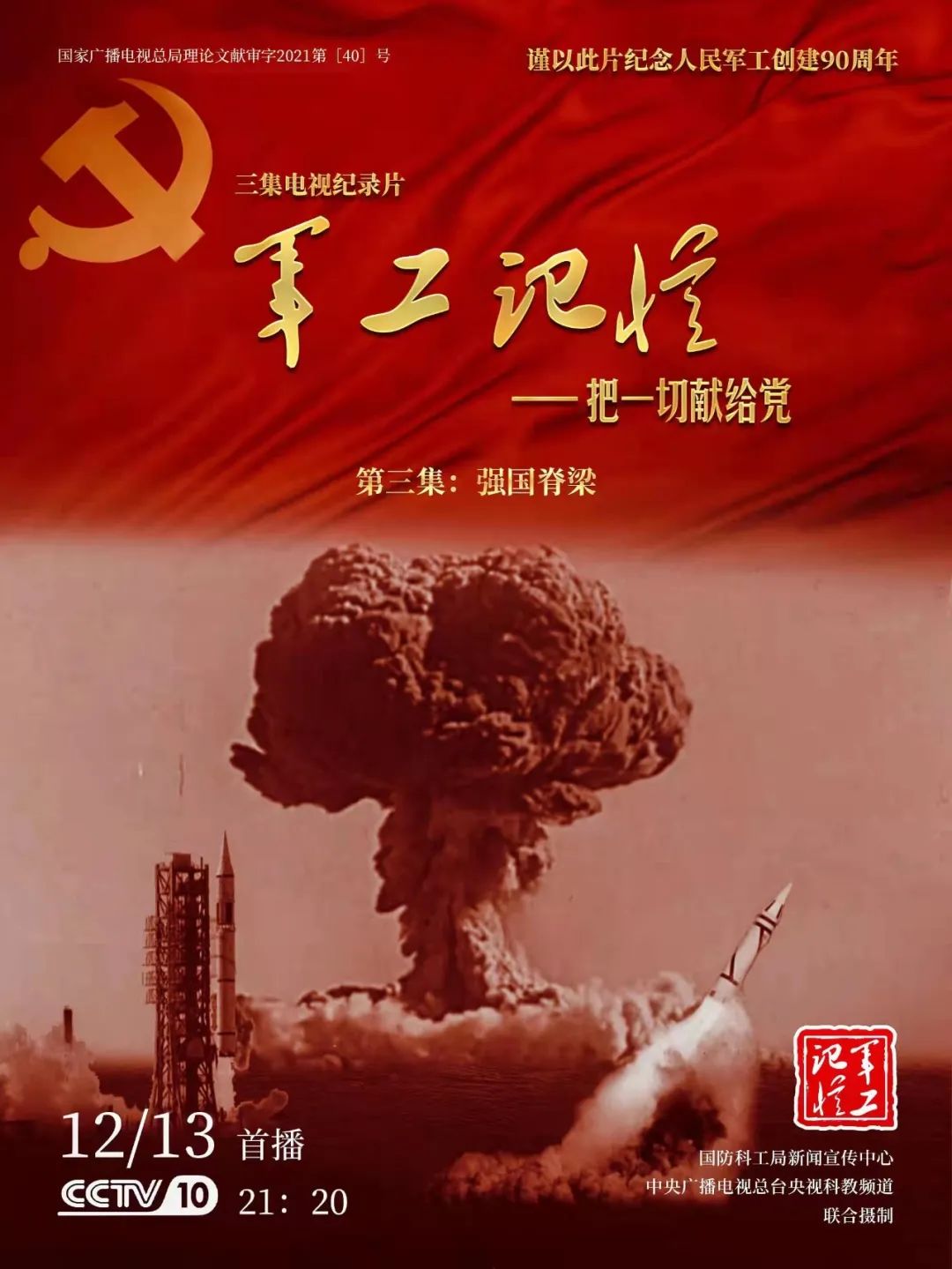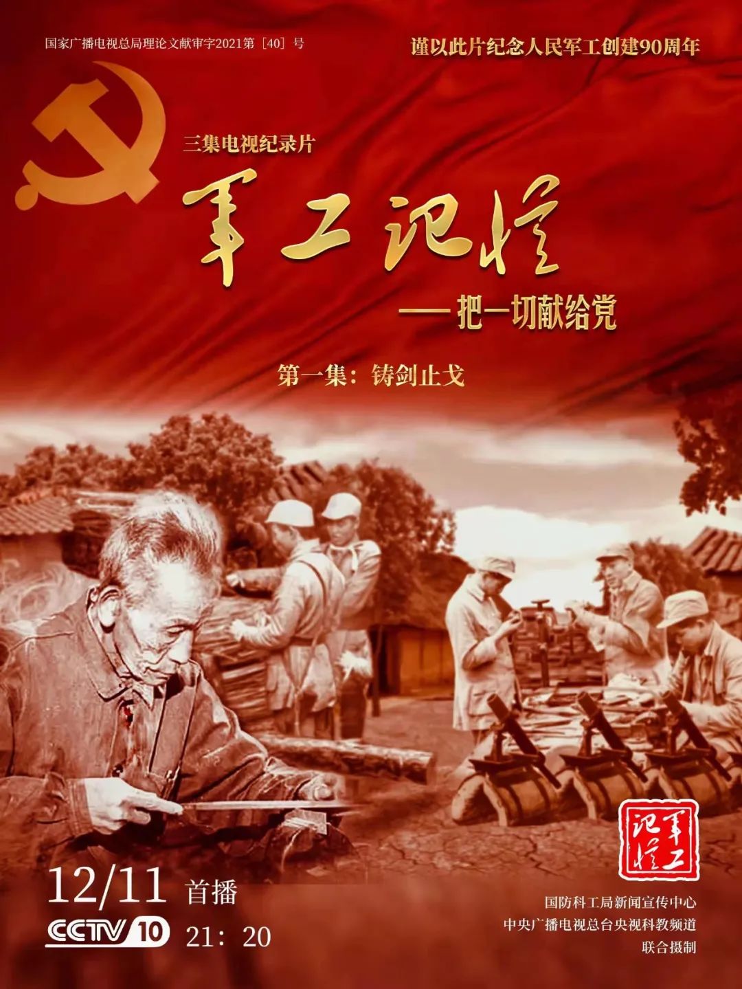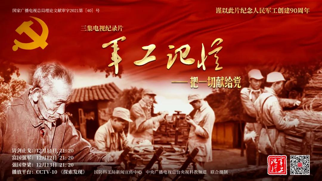 為慶祝中國共產黨成立100周年,紀念黨領導下的人民軍工創建90周年,由國防科工局指導,國防科工局新聞宣傳中心聯合中央廣播電視總臺社教節目中心攝制,各軍工集團大力支持的3集重大理論文獻電視紀錄片《軍工記憶——把一切獻給黨》,將于12月11日21:20在央視科教頻道(CCTV-10)《探索發現》欄目首播,連續播出3天。該紀錄片旨在向建黨百年獻禮,向人民軍工90周年致敬,向全社會弘揚軍工精神傳遞軍工文化,激勵國防科技工業戰線廣大干部職工不忘初心、接續奮斗,為實現強軍強國夢想貢獻力量。