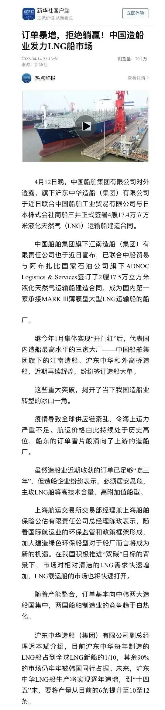 近日,新華社以《訂單暴增,拒絕躺贏!中國造船業(yè)發(fā)力LNG船市場》為題,關注了中國船舶集團發(fā)力LNG船市場接連簽訂造船大單的重大突破!