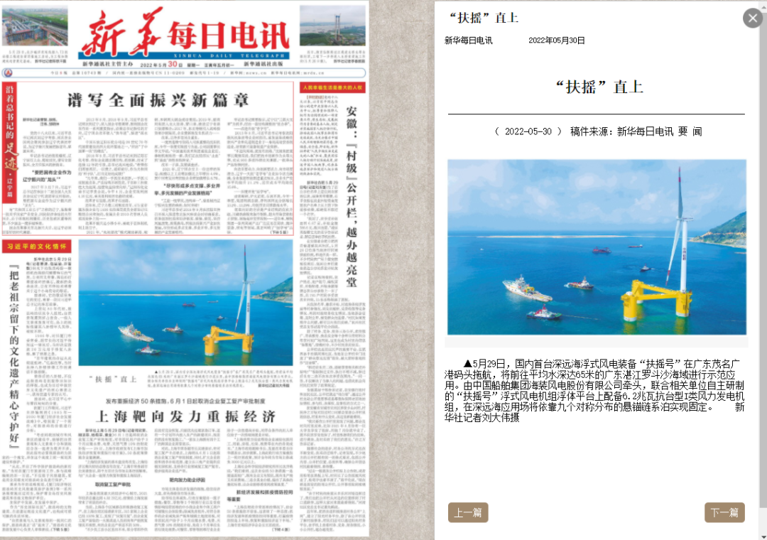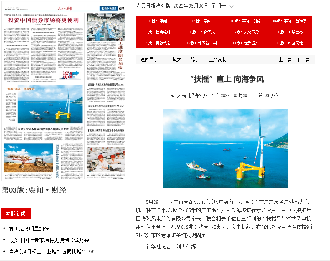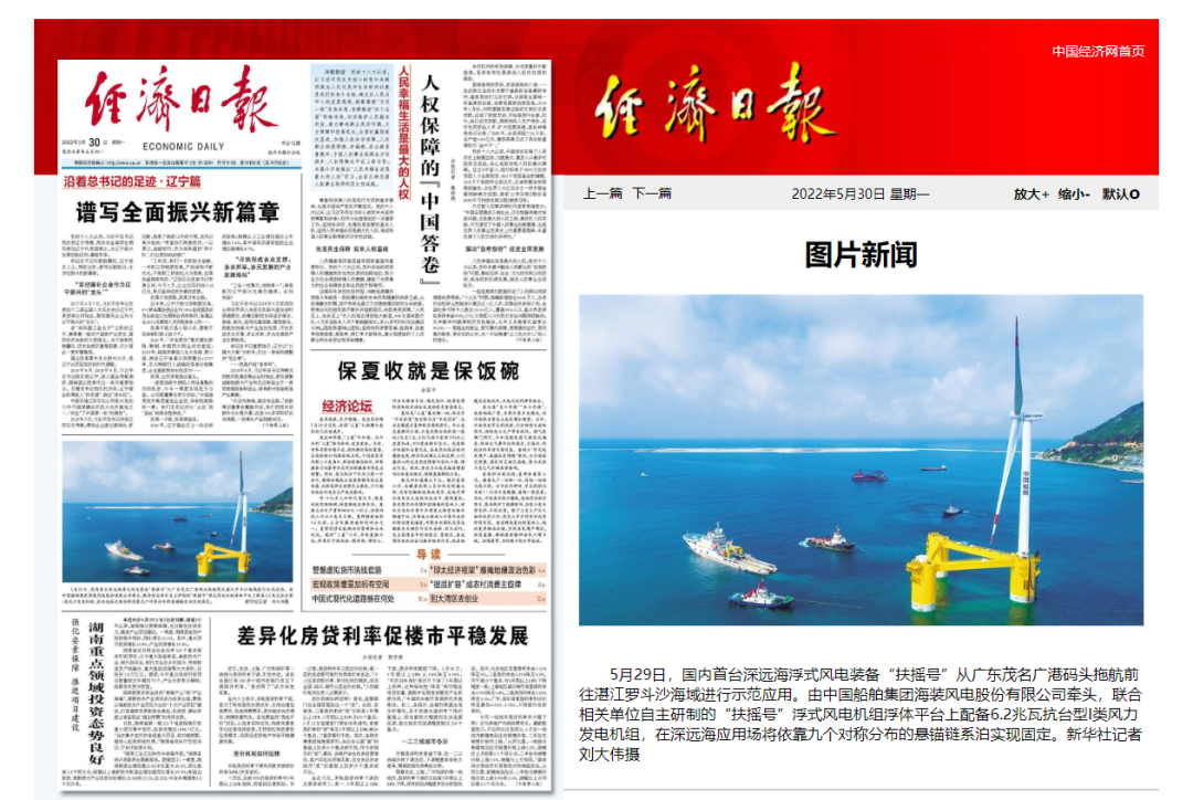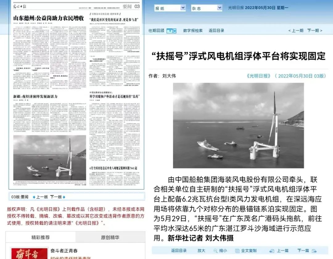 5月29日,中國船舶集團旗下中國海裝牽頭研制的國內首臺深遠海浮式風電裝備——“扶搖號”從廣東茂名碼頭起航,前往平均水深65米的廣東湛江附近海域投入示范應用。