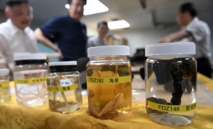 3月11日,“探索一號”科考船攜“奮斗者”號全海深載人潛水器抵達三亞,科研人員在介紹采集的深淵宏生物、巖石、結(jié)核、沉積物樣品。新華社記者 陳凱姿 攝