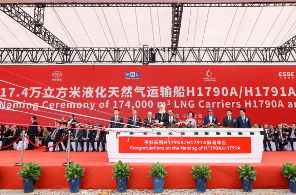 9月10日,中國船舶集團旗下滬東中華聯合中船貿易與卡塔爾能源液化天然氣公司,為“卡塔爾百船建造計劃——卡塔爾北部氣田擴能船舶購置項目”17.4萬立方米大型LNG運輸船首船“雷克斯·蒂勒森”號、2號船“烏姆·古瓦伊琳娜”號舉行命名儀式。卡塔爾能源事務國務大臣、卡塔爾能源總裁兼首席執行官薩阿德·謝里達·阿爾卡比,中國船舶集團黨組成員、總會計師賈海英等出席命名儀式。