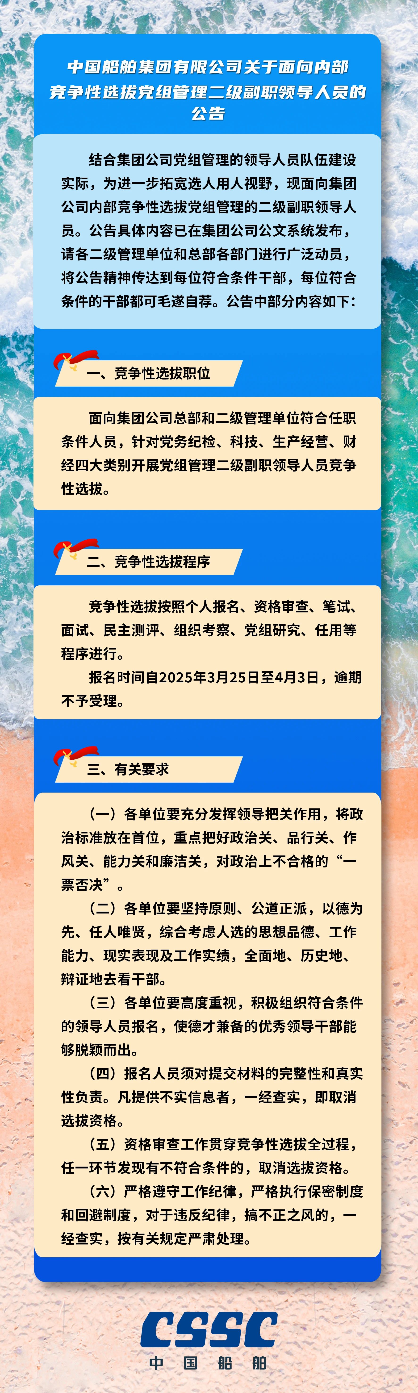 中國船舶集團(tuán)有限公司關(guān)于面向內(nèi)部競爭性選拔黨組管理二級副職領(lǐng)導(dǎo)人員的公告